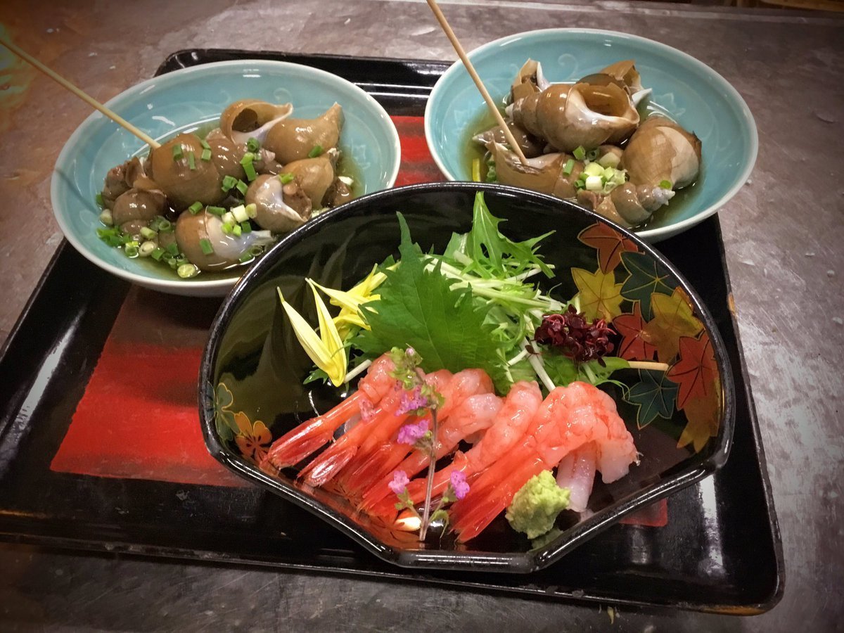 南蛮えび刺身、バイ貝旨煮です。